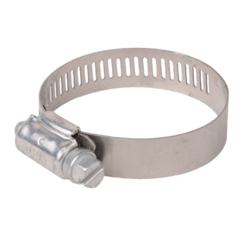 The DiversiTech® B-32H Silver Hose Clamps, SAE No. 32, 1-9/16 in. – 2-1/2 in. Diameter, partial stainless, worm drive, adjustable. 300 series stainless steel 1/2 in. band with plated 5/16 in. slotted hex head screw and housing, except the B-4H which has a 5/16 in. band and 1/4 in. nut. Recommended for most applications. 100% interlock construction features one-piece housing which directly locks into band.